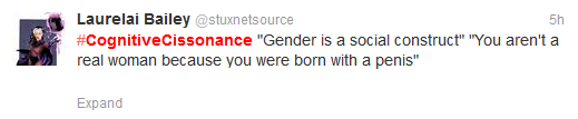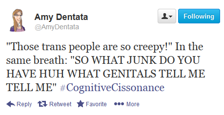 On September 2, the hashtag #CognitiveCissonance made its way around twitter, mostly from trans* people. Started by @AmyDentata, the obvious word play on cognitive dissonance was made to point out the hypocritical and double-standard that many cis people have towards the identities, presentations, and lives of trans* people. For example, the idea that trans women must present en femme to really be women and that trans men must be masculine to truly be male. Cognitive cissonance was a witty way to expose every day trans*phobia and cissexism.