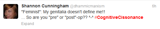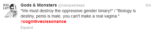 Trans* and cis people both got involved in #cognitivecissonance, pointing out the double standards and problems that plague trans* people in their everyday lives. Soon tweets were pouring in using the tag. People began to point people towards the tag as a means of education of the issues trans* people faced. Wit captured in 140 characters was the platform for education.