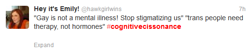 “My snark comes from a place of wanting positive change,” Amy told me, “I hope it’s done at least a tiny amount to keep that change coming.” While Amy did not expect #cognitivecissonance to take off, she is certainly pleased by it. Cis people have been coming fourth and saying they have learned a lot about the issues trans* people face in their lives. Twitter allowed for an open platform for people to share their experiences with cognitive cissonance, something that every trans* person has experienced at one point or another.