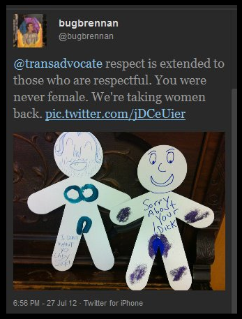 So, when Brennan says that if people respect her, she will respect them, it is a blatant lie. Her beliefs do not stop at being that. She is not someone who simply is vocal. She goes beyond that. Brennan actively harasses trans women and those that support them. She has contacted the schools and work places and trans women and trans* activists with proclamations of harassment and lesphobia. Also, according to Brennan, calling her out on her trans*phobia is attacking women and lesbians. According to her, trans*phobia is a right for people to have, even when it means people may lose their jobs, be kicked from school, or even out them. She runs several websites where she outs trans women and lists them along with rapists (since according to her, the existence of trans women is rape), whether they are publicly out or not. Simply put, if you have not figured it out, Brennan does not understand what the words rape, harassment, and lesphobia mean.