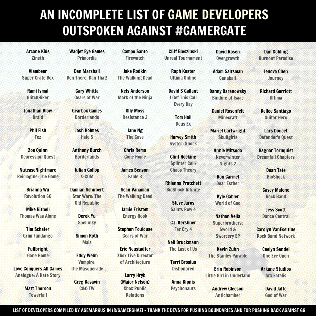 Ignoring the fact that gaming and thus, gaming reviews, are subjective and that objective game reviews are an oxymoron, let’s take a deeper look into this demand. As previously stated, one of the big hubs for GamerGate is the subreddit /r/KotakuinAction. This is a spin-off of /r/TumblrinAction. Both of these places exist to mock people they deem Social Justice Warriors (SJWs) or people who believe in the causes of social justice and thus point out racism, sexism, transphobia, ableism, and other forms of oppression in society and gaming. According to GamerGate, Kotaku has ‘fallen’ to these people and is thus a hub for their ideas and ideals. For GamerGate, anyone who have vehemently opposed GamerGate is a SJW which includes people like Felicia Day, Anthony Burch (head writer of Borderlands 2) and his sister Ashly Burch (of Hey Ash Whatcha Playin fame), Tim Scafer (Double Fine) and most recently the CEO of Blizzard, Mike Morhaime. There is also a list of game developers who have come out against GamerGate. Even entire organizations have come out against GamerGate such as the Entertainment Software Association.