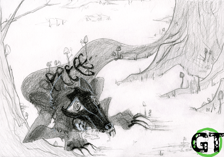 Now, you go to the forest even though you forgot to bring anything. You trip over the root of the tree where you’ve been placing your offerings and you scrape your knee. While on the ground, you notice the black ooze you thought came from the mushrooms is forming a pattern like a frail canine skeleton. Tonight, you leave blood and skin.