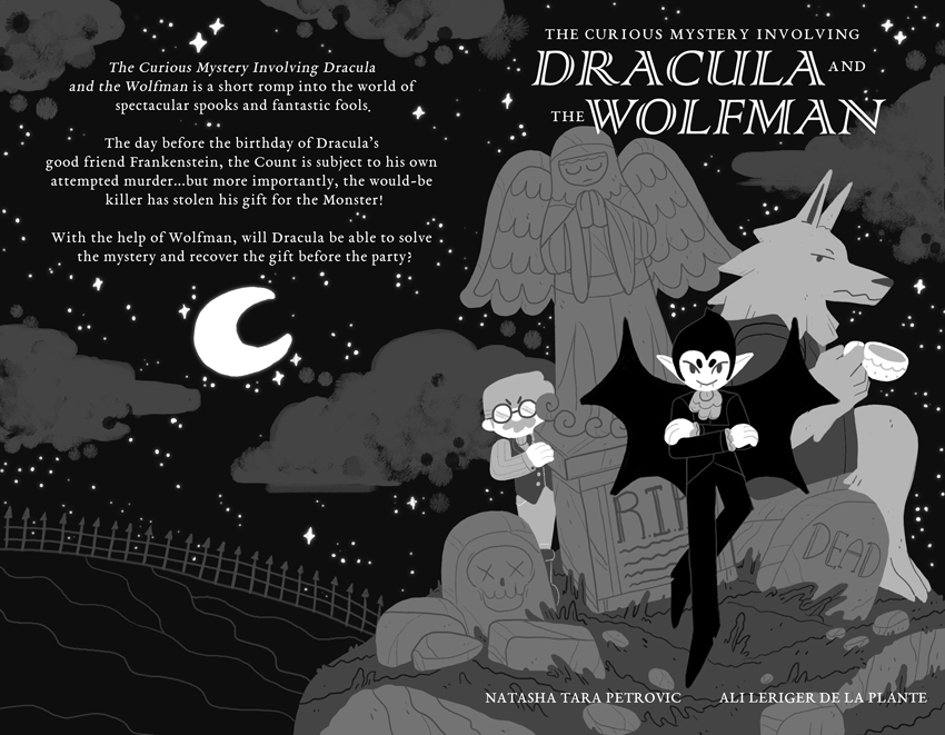 Natasha & Ali: The Curious Mystery Involving Dracula and the Wolfman is a short comic based on a short story written by Ali, and adapted to visual format by Natasha. It follows the story of Dracula, who has been stabbed and burgled by an unknown assailant. He, along with Wolfman, must track down the thief, who has stolen the gift for Frakenstein’s birthday the following day. It’s a mystery/comedy with your favourite bloodthirsty monsters.