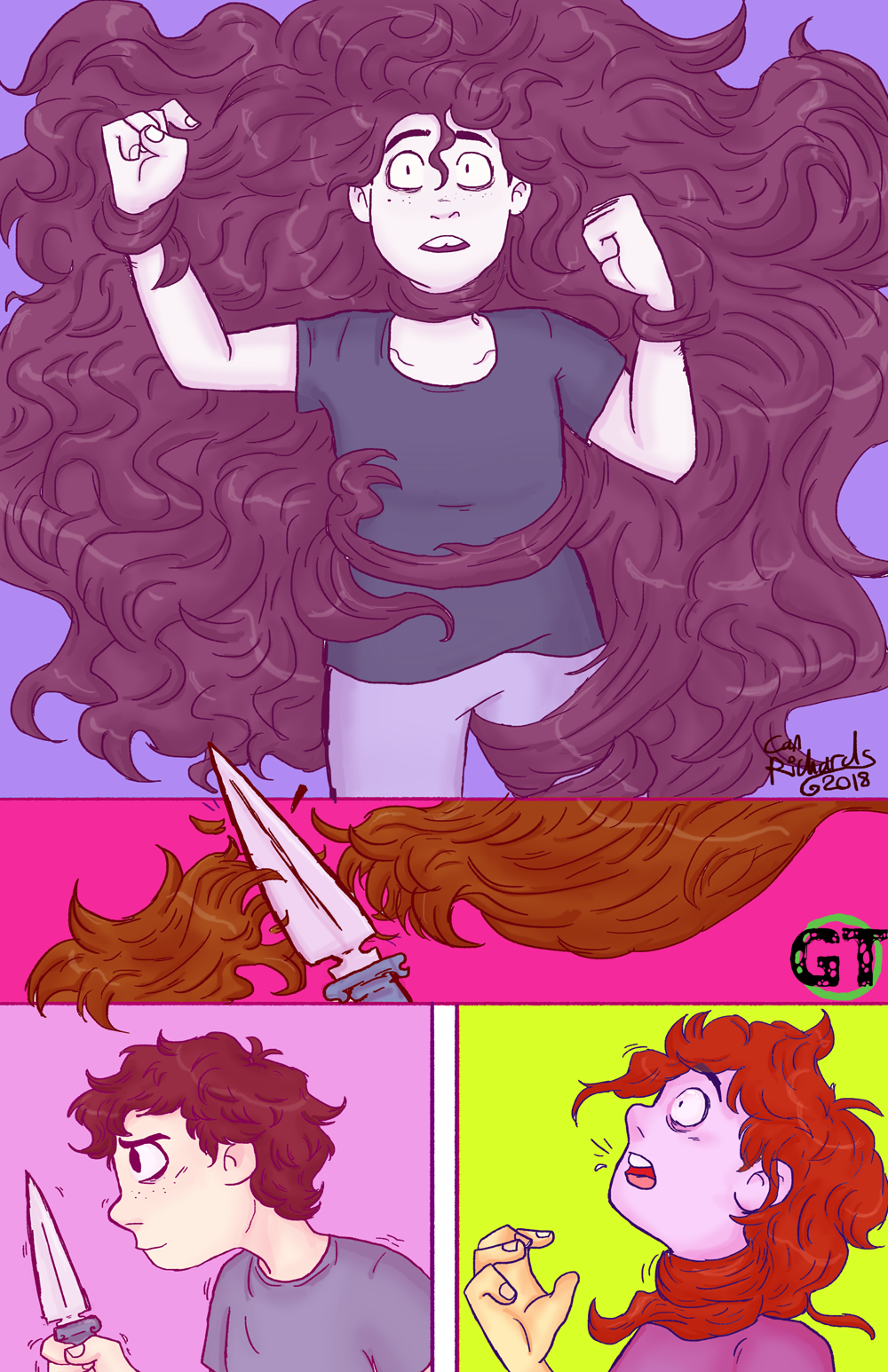 On my 13th birthday, I got it cut to “normal girl length” for the first time, and finally felt the freedom of my hair not being a (almost literal) ball-and-chain. And yet still, every time I watched or read about a character defiantly chopping their hair off, I felt a pressing urge to do the same. Like that scene in the Shade the Changing Girl comics, where the alien Shade takes full ownership of the bodily vessel she’s possessing, chopping the long hair as a symbol of pursuing her own fate.